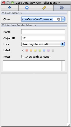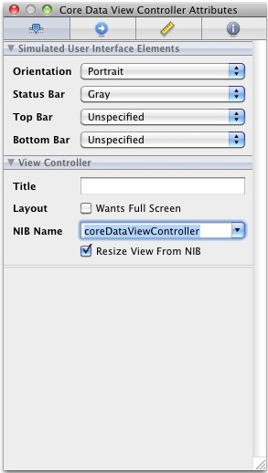 Display the Attributes page by selecting the far left toolbar button in the inspector window and assign coreDataViewController as the NIB file: