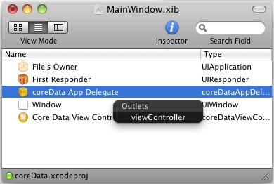 Finally, establish a connection between the application delegate and the view controller. This is achieved by ctrl-clicking on the core Data App Delegate item in the MainWindow.xibwindow, dragging the resulting blue line to Core Data View Controller item in the same window and selecting viewController from the menu: