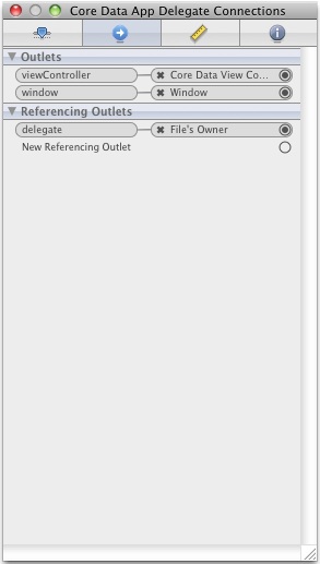 With the Core Data App Delegate item selected in the MainWindow.xib file and the Connections Inspector displayed, the settings should appear as shown in the following figure: