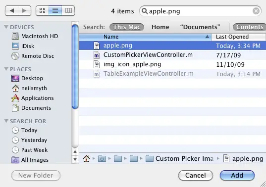 Now that we have created a simple table view example we can look at extending our code to change the cell style. In so doing we will make use of the image and detailed text properties of the cell object to add images and subtitles to each row of the view. The first step is to add an image to the resources of our project. If you already have an image file that is suitable for this purpose feel free to use it in this example. Alternatively, we can pick up an image from the Mac OS X system on which Xcode is running. To add an image file to the application resources, right click on the Resources entry in the Groups and Files panel of the main Xcode project window. From the resulting menu, select the Add -> Existing Files… option. In the resulting file selection panel navigate to and select your pre-existing image file. Alternatively, enter apple.png into the search field and press Enter. The apple.png file should appear in the file list from where it can be selected:
